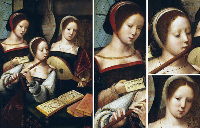 Да, стихи идеально гармонируют с тонким сюжетом и образом героинь. Советский и российский музыкант А. Е. Майкапар изучил нотную запись на картине и пришел к выводу, что певица слева исполняет партию сопрано, флейтистка в центре играет по теноровой партии, а лютнистка справа аккомпанимирует по памяти, не глядя в ноты. Ее скромный и нежный взгляд направлен прямо на зрителя.