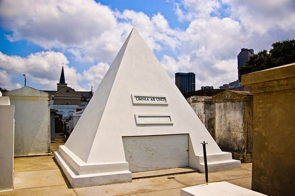 На самом деле кладбище Сент-Луис в Новом Орлеане уже закрыто - этому кладбищу уже более двух сотен лет, здесь похоронено немало известных личностей, но современные захоронения почти не ведутся. Несмотря на это, Николасу Кейджу удалось выкупить достаточно большой участок для себя, где он впоследствии установил почти трехметровую пирамиду. На сегодняшний день на этом изваянии нет имени актера, и единственное, что написано на этом необычном постаменте - "Omnia Ab Uno", что можно перевести с латинского как "Всё из одного."