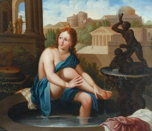 Есть и ещё одна женщина из Ветхого Завета, которую изображали купающейся и обнажённой. Это Вирсавия, и от Сусанны её можно отличить по тому, что за ней или не подсматривают вовсе, или это делает один мужчина, а не двое. Вирсавия была женой мужчины по имени Урия, служившего в войске царя Давида. Однажды, гуляя по крыше дворца, Давид увидел, как Вирсавия моется в саду, и завожделел её.