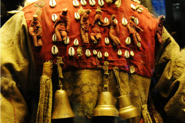 Костюм шамана также имел множество функций и значений, а по сему был сделан весьма умело и поражал воображение любого человека извне. Головные уборы с рогами, плащи с подвесками, перьями вызывали огромный интерес у ученых, путешествовавших по Сибири в XVIII–XIX веках. Знаменитый естествоиспытатель Петр Симон Паллас так описывал облачение тунгусской (эвенкийской) шаманки. «Как скоро стало смеркаться, то пришла она к огню, раскладенному за несколько времени перед одним шалашом, а шаманское ее платье, бубен и костыль несли молодые ребята; за нею шло несколько молодых баб и девок, которые будут ей в пении подтягивать. Платье ее, которое она перед огнем надевала на голое тело, походило на хороших колдунов одежду; кожаный халат извешен был вокруг разными железными гремушками и другими медными фигурками, позади с плеч множество висело разноцветных змей и хвостов, из коих к одному привязан был маленький колокольчик. Шапка была простая кожаная, и наместо железных рогов, кои б к ней приделаны быть должны, пришиты были к плечам рогам подобные машины, на кои нацеплены были железные лягушки».