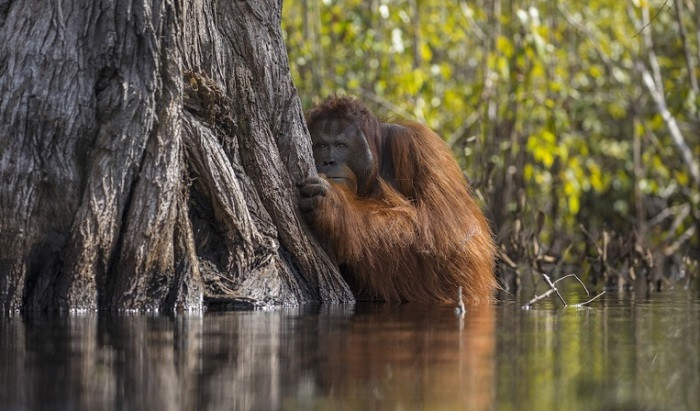1. Орангутанг пересекает реку на снимке «Лицом к лицу на реке в Борнео»