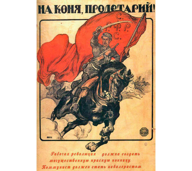 «На коня, пролетарий! Рабочая революция должна создать могущественную красную конницу. Коммунист должен стать кавалеристом»