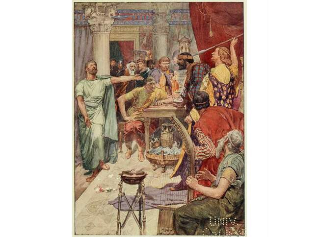 Не в силах больше слушать, как придворные льстецы принижают Геракла и Диоскуров, превознося македонского царя как первого среди полубогов, Клит смело и страстно заявляет, что подвиги Александра совершены всеми македонцами. Его пробовали утихомирить, но он не унимался и требовал, чтобы Александр при всех сказал то, что думает. Наконец, его вытолкали из пиршественной залы. Клит вернулся через другие двери. Протягивая руку, Клит кричал Александру: «Вот эта самая рука спасла тебе жизнь» (такое действительно было в сражении при Гранике). Выхватив копье у стражника, Александр Македонский убил его.