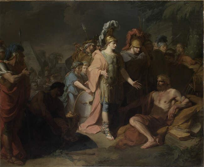 К этому времени принадлежит и знаменитая сцена с Диогеном, пересказанная бессчетное число раз множеством писателей. После энергичных военных мер македонского царя, вернувших ему влияние в Греции и ожививших планы войны в Азии, многие известные люди поспешили засвидетельствовать ему свое почтение.