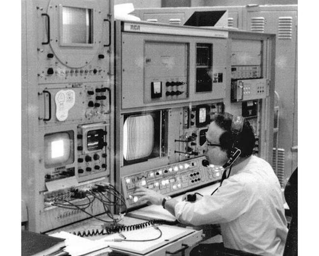 Инженер Эд фон Ренуар перед консолью скан-конвертора — прибора, превращавшего сигнал с медленной разверткой с лунной камеры в понятный земным телесетям