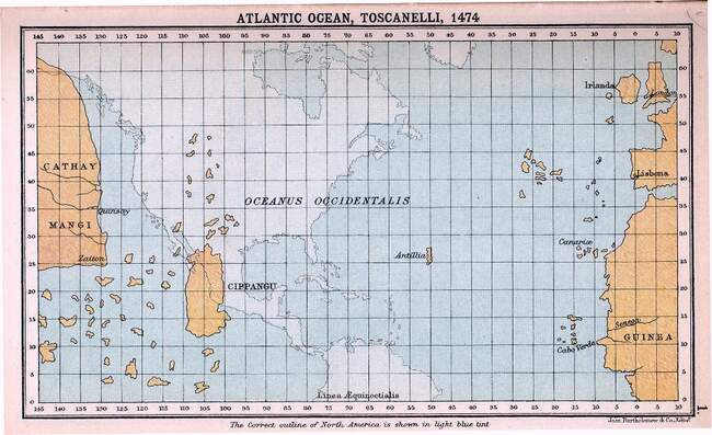 Планируя свое путешествие в Азию, Колумб руководствовался примерно такой картой работы астронома Паоло Тосканели. Слева и справа на ней изображены соответственно Азия и Европа с Африкой, а остров, обозначенный словом Cippangu, — это, по мнению картографа, Япония. Силуэт обеих Америк добавлен на карту уже в наше время для сравнения представлений большого числа европейцев в XV веке об устройстве планеты с реальным положением дел