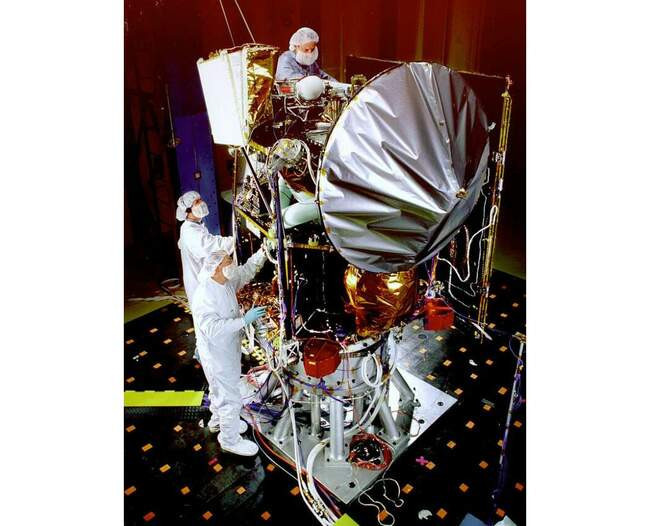 Здесь Mars Climate Orbiter показан во время испытаний. Аппарат весил 634 кг (включая 291 кг топлива) и имел размеры 2,1×1,6×2,0 м. Американским налогоплательщикам программа Mars Surveyor ’98, частью которой стал запуск Orbiter, обошлась в 327,6 млн долларов, включая стоимость постройки и вывода двух аппаратов в космос. Единственным научным результатом программы можно считать снимок Марса, сделанный камерой Orbiter с расстояния 4,5 млн км