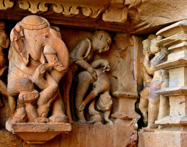 На внешних стенах храмов в Кхаджурахо можно увидеть все разнообразие сексуальной жизни древних индийцев. Тут и классика, и оргии, и сцены орального секса. Есть даже изображения секса мужчин с лошадью и то, что можно трактовать как секс женщины со слоном (ну или богом со слоновьей головой).