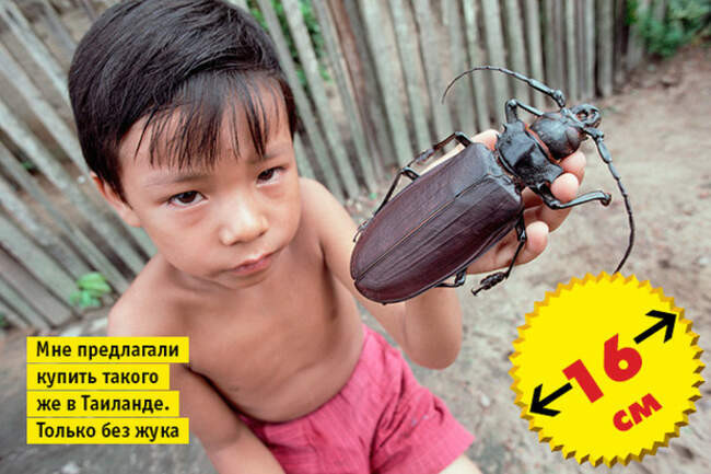 Ребенок и не подозревает, как зовется то, что он держит в руках. Или, наоборот, это оно держит ребенка? Жук дровосек-титан испокон веков славится габаритами, и дорасти до 16 см для него не проблема. Живет жук в тропиках и для человека совершенно неопасен. Повторяй это про себя, если обнаружишь такое в постели.