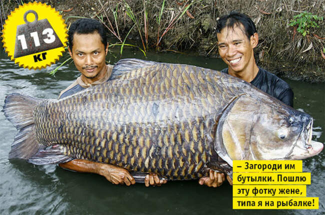 Если у тебя есть друг-рыбак, ни в коем случае не показывай ему это фото. А если ты сам рыбак — крепись. Потому что перед тобой самый большой в мире карп (весоизмещением 113,5 кг). Поймал его неприметный тайский рыбак на — сенсация! — удочку домашнего производства. Лично мы теперь не можем смотреть на свой электрический спиннинг с полным приводом и цветомузыкой.