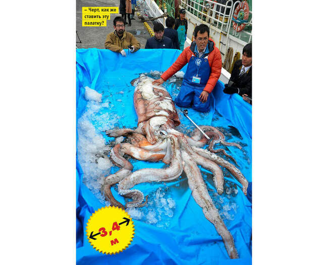 Мы не знаем японского, но можем предположить, что, когда рыбаки префектуры Тоттори выловили это чудо, они кричали: «Ух ты!» И есть из-за чего. По данным ученых с рулеткой, длина гигантского кальмара составляет 3,4 м! Наши поздравления рыбакам и соболезнования кальмару.