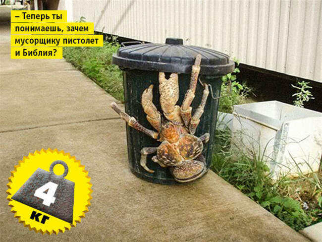 Перед тобой еще один довод в пользу невыноса помойки. Кокосовый краб — одно из крупнейших наземных членистоногих. В отличие от типовых крабов, он живет на суше и способен карабкаться по стенам и деревьям. Долгое время считалось, что краб срезает кокосы с пальм, за что ему и дали кличку «пальмовый вор».