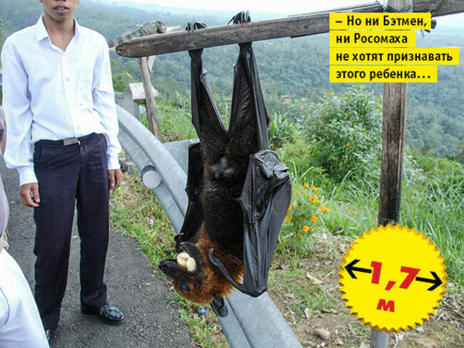 Поначалу кажется, что это фото из новостных агентств, помещенное под заголовком «Пьяный Дракула отказался покидать место ДТП». На самом деле это представитель семейства крылановых — летучих лисиц — в естественной среде обитания, на полуострове Малакка. Крылановые могут достигать 42 см в длину, а размах их крыльев порой равняется 1,7 м. Поэтому ими положено любоваться и подкармливать их, как показано на фото.